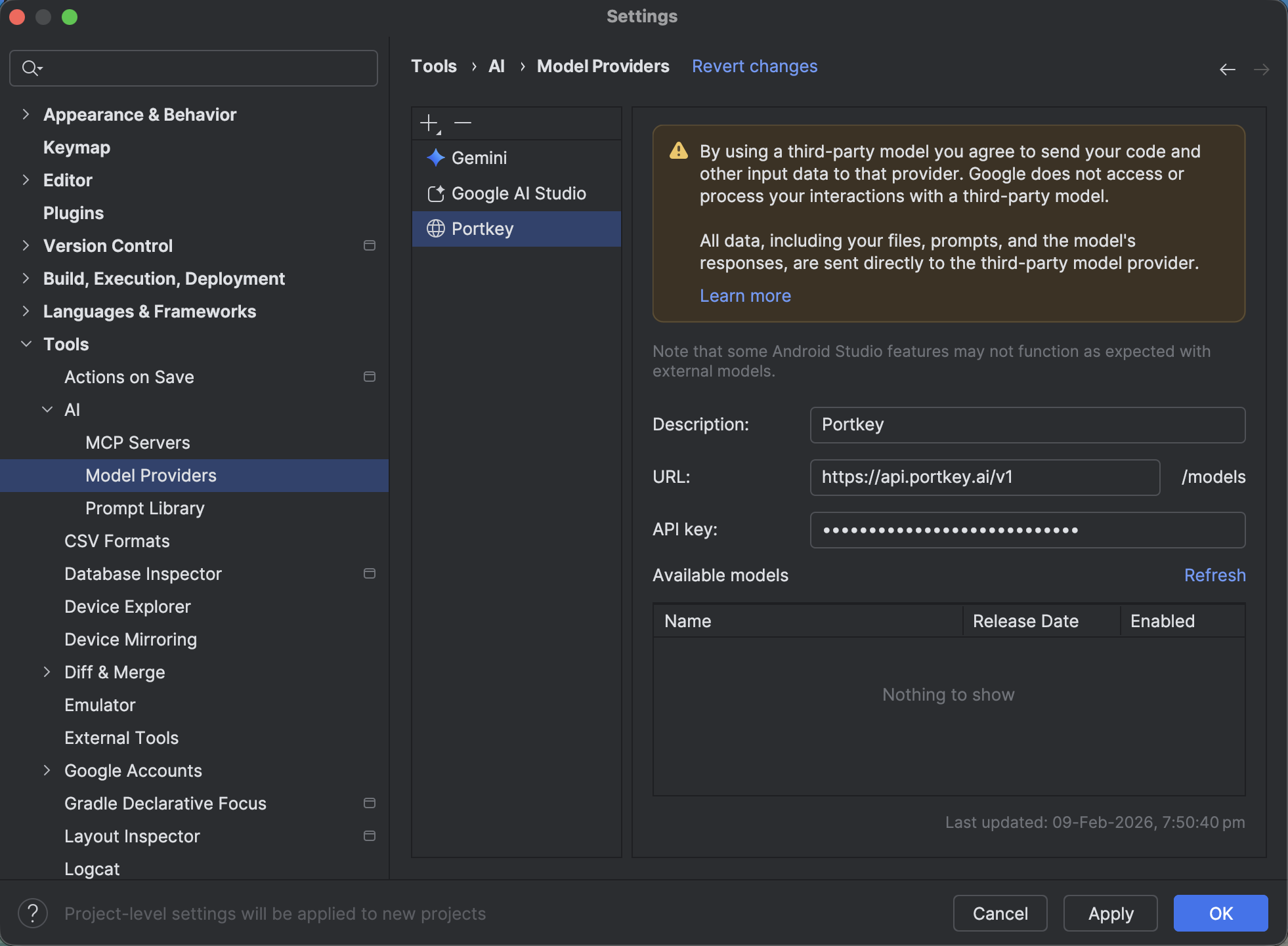 Follow Android Studio’s Use a remote model flow and use Portkey as the provider:Open Model Providers